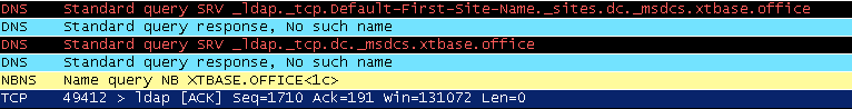 Then it dawned on me. Maybe the domain that could not be contacted, isn’t the domain I’m logged in to? As far as I was aware, there were no other domains to contact, but the CRM server seems to think otherwise. I decided to load up Wireshark on the CRM server to capture the packets and find out what exactly the CRM server was trying to contact. I got to the stage just before I knew then error would occur in the wizard, then started capturing packets. I hit the Next button in the wizard and then immediately saw this in the Wireshark window: –