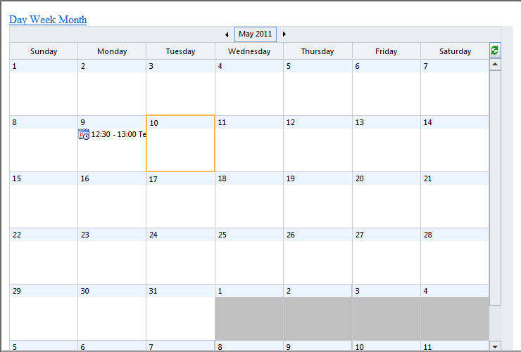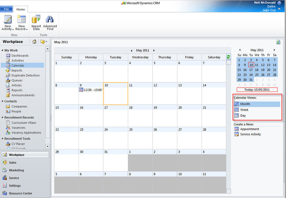 Hi Neil!I tried your example above, and all looks as it should except that I don’t see the appointment on the calendar object itself. And when I try to navigate to the other object (Day, Week or Month), I get a JScript error message. At the bottom of this comment is the error report that is built to be sent to Microsoft. It seems to me that there’s a missing link: how does the object knows to hook up with the activities?Thanks for your time!Error report:Microsoft Dynamics CRM Error Report Contents <CrmScriptErrorReport> <ReportVersion>1.0</ReportVersion> <ScriptErrorDetails> <Message>Unable to get value of the property ‘parentElement’: object is null or undefined</Message> <Line>1</Line> <URL>/_static/calendar/calendar.js?ver=1828130457</URL> <PageURL>/calendar/Month.aspx?date=2012-06-05T14%3a13%3a25Z</PageURL> <Function></Function> <CallStack> </CallStack> </ScriptErrorDetails> <ClientInformation> <BrowserUserAgent>Mozilla/4.0 (compatible; MSIE 7.0; Windows NT 6.1; WOW64; Trident/5.0; SLCC2; .NET CLR 2.0.50727; .NET CLR 3.5.30729; .NET CLR 3.0.30729; Media Center PC 6.0; InfoPath.3; .NET4.0C; .NET4.0E)</BrowserUserAgent> <BrowserLanguage>en-us</BrowserLanguage> <SystemLanguage>en-us</SystemLanguage> <UserLanguage>en-us</UserLanguage> <ScreenResolution>1920×1200</ScreenResolution> <ClientName>Web</ClientName> <ClientTime>2012-06-05T10:13:26</ClientTime> </ClientInformation> <ServerInformation> <OrgLanguage>1033</OrgLanguage> <OrgCulture>1033</OrgCulture> <UserLanguage>1033</UserLanguage> <UserCulture>1033</UserCulture> <OrgID>{A4A4B096-7D76-481A-8A5E-2840FA92F6D1}</OrgID> <UserID>{28A84D3E-F3B7-E011-828F-000C2965EDF5}</UserID> <CRMVersion>5.0.9690.2165</CRMVersion> </ServerInformation></CrmScriptErrorReport>