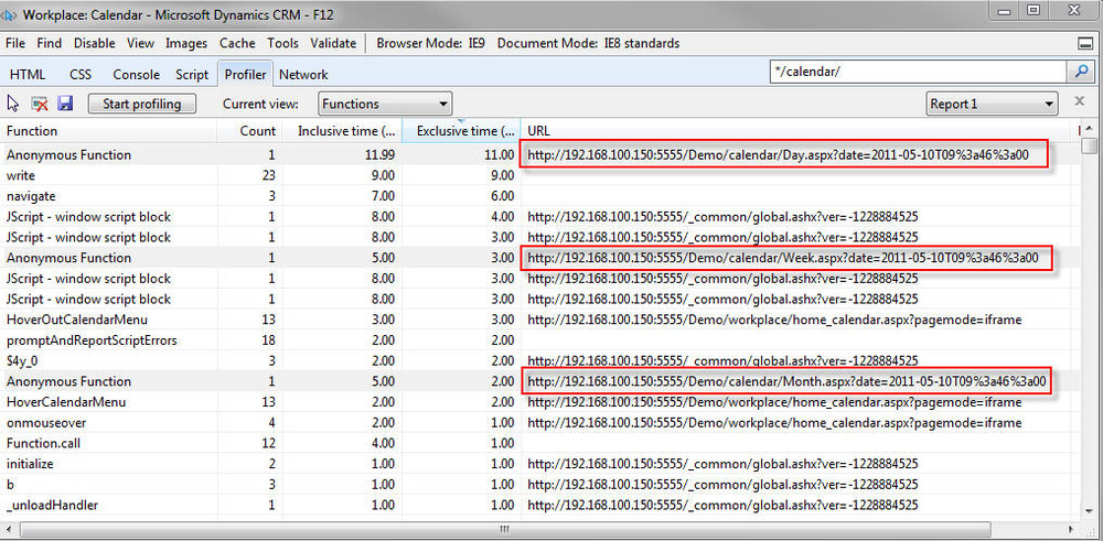To do this, first we need to get the URL of the Calendar page. Load up the IE developer tools (F12 in IE9) and start a profiler. Now navigate to the calendar in CRM and click on ‘Month’, ‘Week’ and ‘Day’ (we want the URL for each page).