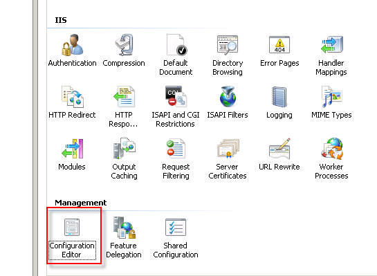 - In Internet Information Services Manager, click the <Server name>, scroll down in the Features View to the Management section, and then start the Configuration Editor.