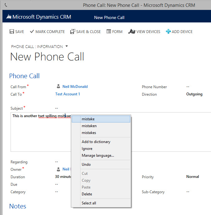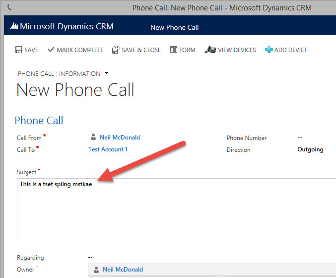 Recently, a customer has found that spell checking is not available when typing into forms on the CRM Outlook client. Spell checking is built into Internet Explorer and works fine on the web client, so I wanted to find a way to get it working in Outlook.